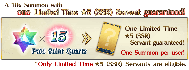 This Summon will have one guaranteed Limited Time ★5 (SSR) Servant, one guaranteed ★4 (SR) or above card, and one guaranteed ★3 (R) or above Servant!