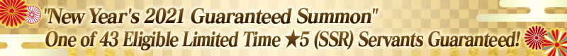* For the "New Year's 2021 Guaranteed Summon", the only ★5 (SSR) Servants summonable will be the Limited Time ★5 Servants added to the game by the end of 2020. ★5 (SSR) Servants available from Story Summon will not be summonable.