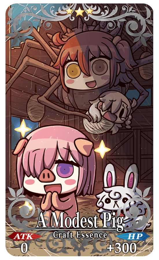 A Modest Pig ATK 0 HP 300 (MAX: 1500) Skill Increase the amount of QP earned by 2021 when completing quests |
