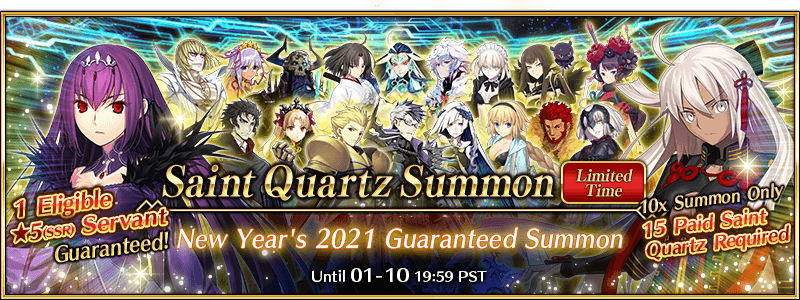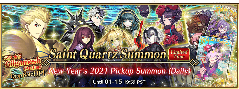 * As the lineup for the "New Year's 2021 Pickup Summon (Daily)" will change daily, Sigurd, Gilgamesh (Archer), Scáthach (Lancer), Nero Claudius (Caster), Cleopatra, Jeanne d'Arc (Alter) (Avenger), and Katsushika Hokusai will not be summonable on certain days. Please be sure to confirm the lineup before summoning.