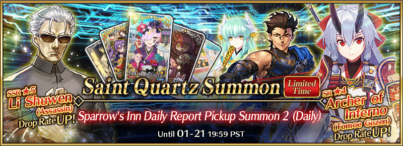 * Li Shuwen (Assassin) will be available from Story Summon beginning at 2021-01-07 20:00 PST for Masters who have cleared Lostbelt No.3.