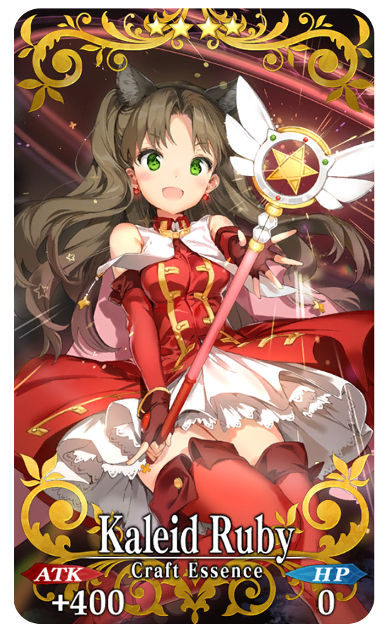 ★★★★SR Kaleid Ruby ATK 400 (MAX: 1500) HP 0 Skill Increase Buster Card effectiveness by 10% & NP Strength by 8% for yourself + Increase ATK Strength by 50% only if equipped by [Female] Servants & Increase Buster Card Strength by 50% during "World End Match" [Event only]