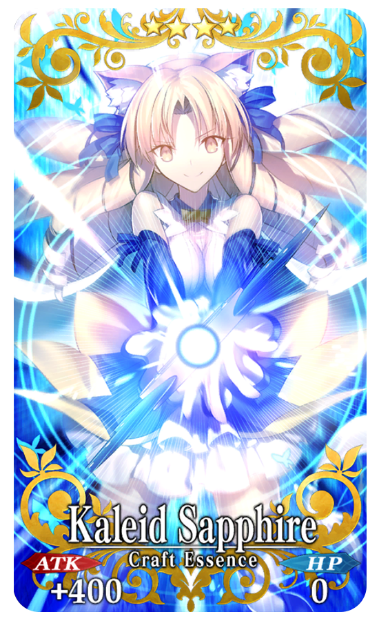 ★★★★SR Kaleid Sapphire ATK 400 (MAX: 1500) HP 0 Skill Increase Arts Card effectiveness by 10% & NP Strength by 8% for yourself + Increase ATK Strength by 50% only if equipped by [Female] Servants & Increase Arts Card Strength by 50% during "World End Match" [Event only]