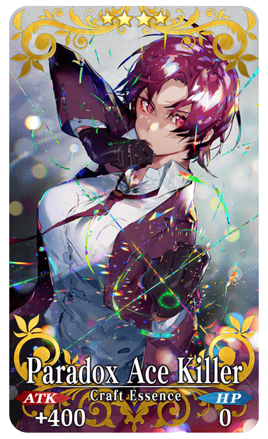 [Newly Added Craft Essence] ★★★★SR Paradox Ace Killer ATK 400 (MAX: 1500) HP 0 Skill Increase Quick Card effectiveness by 10% & NP Strength by 8% for yourself + Increase ATK Strength by 50% only if equipped by [Female] Servants & Increase Quick Card Strength by 50% during "World End Match" [Event only]