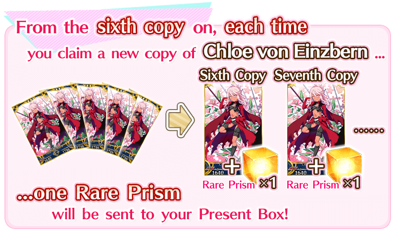 Once you have acquired a total of six copies of "★4 (SR) Chloe von Einzbern," one Rare Prism will be awarded for each new copy of the same Servant, beginning with the sixth.