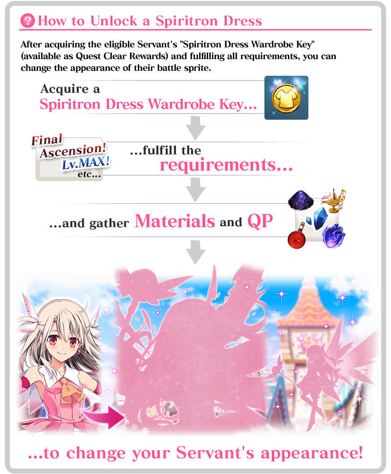 * Upon unlocking a Spiritron Dress, the Servant's battle sprite and icons will automatically be changed. You can revert back to the original appearance or change to a different Ascension level from the Servant Details screen.