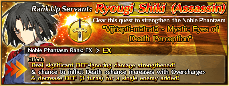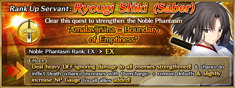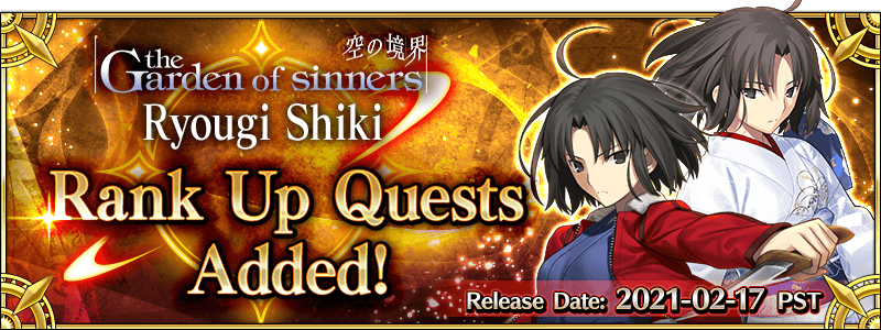 To celebrate "the Garden of sinners" character Ryougi Shiki's birthday (February 17), two Rank Up Quests will be permanently added for "the Garden of sinners" Servants!