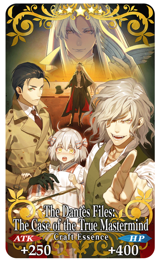 ★★★★★SSR The Dantès Files: The Case of the True Mastermind ATK 250 (MAX: 1000) HP 400 (MAX: 1600) Skill Increase Quick Card effectiveness by 10% & Critical Strength by 10% & NP Gain by 15% for yourself + Increase amount of Hermit Cocktail Shaker per drop by 1 [Event Only]