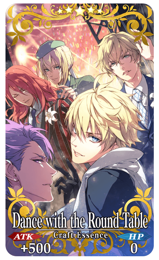 ★★★★★SSR Dance with the Round Table ATK 500 (MAX: 2000) HP 0 Skill Increase C. Star Gather Rate by 400% & NP Gain by 20% for yourself + Increase amount of Hermit Cocktail Shaker per drop by 1 [Event Only]
