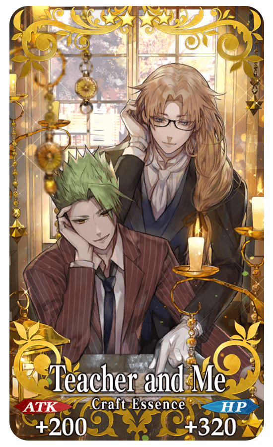 ★★★★SR Teacher and Me ATK 200 (MAX: 750) HP 320 (MAX: 1200) Skill Increase Quick Card effectiveness by 8% & Arts Card effectiveness by 8% & NP Strength by 5% for yourself + Increase amount of Tricky Cloth per drop by 1 [Event Only]
