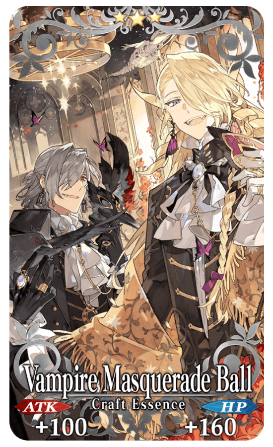 ★★★R Vampire Masquerade Ball ATK 100 (MAX: 500) HP 160 (MAX: 800) Skill Gain 1 C. Star each turn & increase C. Star Drop Rate by 10% for yourself + Increase amount of Spiderweb Coaster per drop by 1 [Event Only]