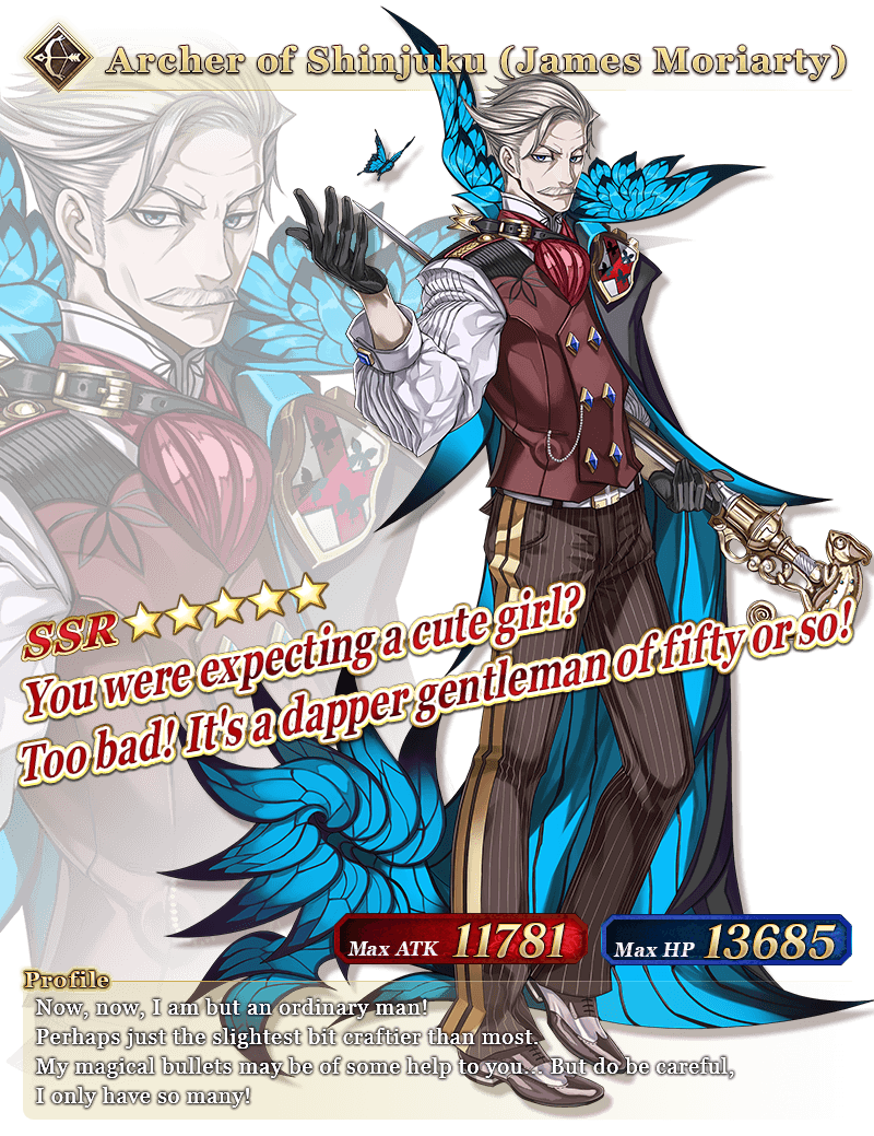 See "★5 (SSR) Archer of Shinjuku (James Moriarty)" in action on YouTube, where we're sharing an exclusive video of his Noble Phantasm!