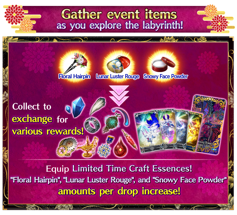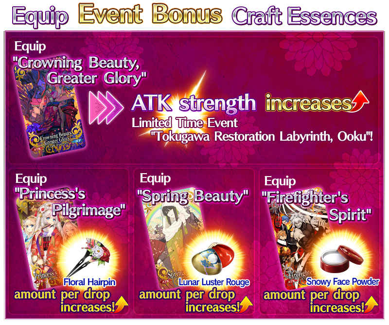 Servants equipped with the Limited Time Craft Essences "★5 (SSR) Princess's Pilgrimage", "★4 (SR) Spring Beauty", and "★3 (R) Firefighter's Spirit", available through the ongoing Pickup Summon, will receive a bonus to the amount per drop of event items "Floral Hairpin", "Lunar Luster Rouge", and "Snowy Face Powder".