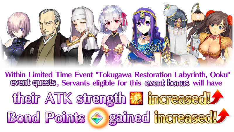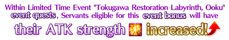 Within "Tokugawa Restoration Labyrinth, Ooku" Event Quests, Certain Servants will be eligible to receive a bonus to their ATK strength, as well as a bonus to Bond Points gained upon clearing quests!