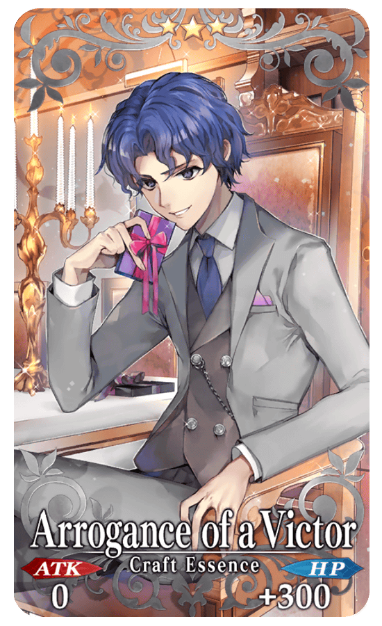 ★★★R Arrogance of a Victor ATK 0 HP 300 (MAX: 1500) Skill Reduce damage taken by 100 & increase C. Star Drop Rate by 5% for yourself |