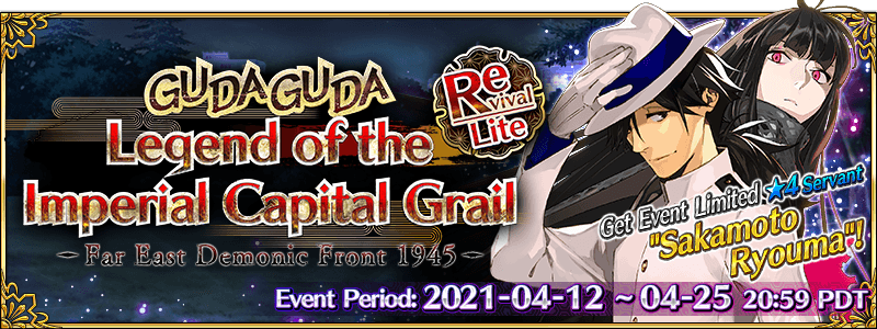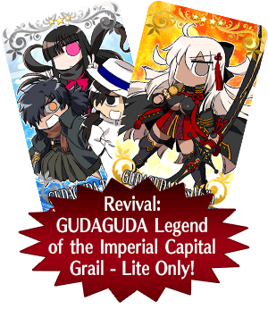 * In-game graphics may vary from the images used within this article. * This is a "Revival - Lite" version of the original 2020 Limited Time Event "GUDAGUDA Legend of the Imperial Capital Grail". Certain elements have been adjusted for a more enjoyable experience. * Please note that if you acquired a Holy Grail in the original event, the equivalent reward will be a Crystallized Lore. * Certain quests will be unlocked at a later date.