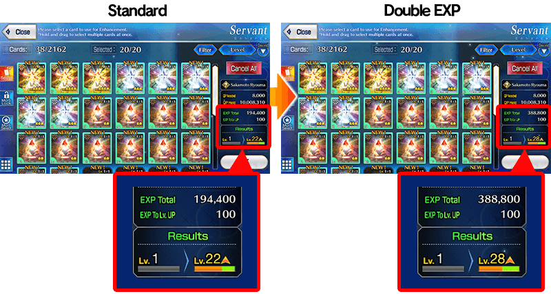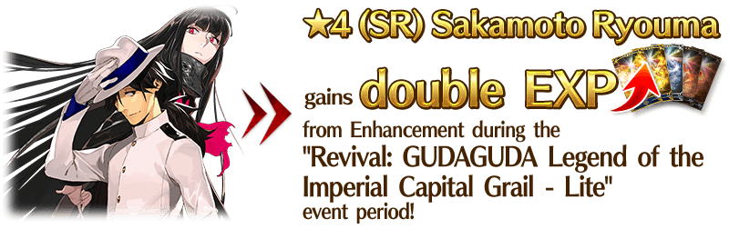 For the duration of the event period, "★4 (SR) Sakamoto Ryouma" will receive double EXP when performing Enhancement.