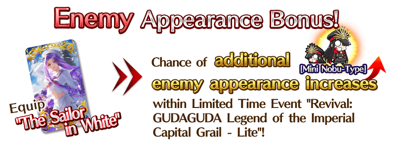The chance of additional [Mini Nobu-Type] enemy appearance will increase when you equip the Event Limited Craft Essence "The Sailor in White". These enemies drop event items, and defeating them is a requirement of certain event missions.