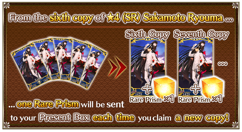 Once you have acquired a total of six copies of "★4 (SR) Sakamoto Ryouma," one Rare Prism will be awarded for each new copy of the same Servant, beginning with the sixth.