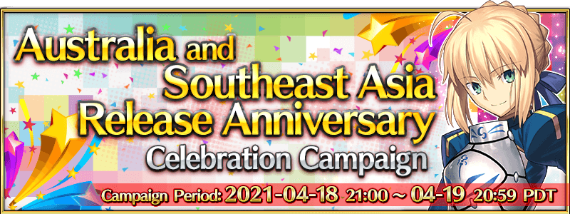 April 19 is the anniversary of the release of FGO English for Australia and Southeast Asia! To celebrate the occasion with all Masters, we've prepared a special login bonus!