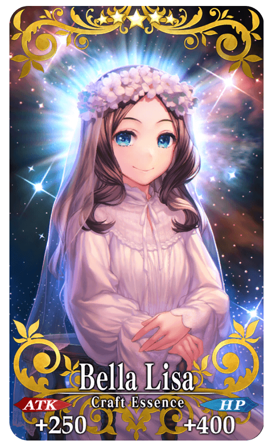 ★★★★★SSR Bella Lisa ATK 250 (MAX: 1000) HP 400 (MAX: 1600) Skill Increase the amount of QP obtainable from drops by 1% (3% if Support) |