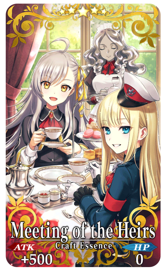 ★★★★★SSR Meeting of the Heirs ATK 500 (MAX: 2000) HP 0 Skill Increase Arts Card effectiveness by 8% & NP Gain by 8% & gain 3 C. Stars each turn for yourself + Increase appearance rate of Rare enemies by 15% in "Lady Reines's Case Files" [Event Only]