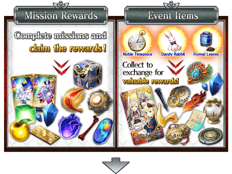 [Event Limited Craft Essence] ★5 (SSR) "Meeting of the Heirs" [Skill Enhancement & Ascension Materials] Mysterious Divine Wine Scarab of Wisdom Phoenix Feather [Ascension Materials] Saber Monument Rider Monument Caster Monument Berserker Monument [Other Items] 10,000 QP |