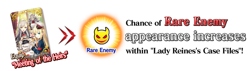 There is a low (25%) chance of Rare Enemy appearance within Collaboration Event "Lady Reines's Case Files" Free Quests.![]() You can increase the chance of Rare Enemy appearance by equipping the Event Limited Craft Essence "Meeting of the Heirs". Each Craft Essence equipped will raise the chance by 15%, giving a 100% chance of Rare Enemy appearance when you have five equipped. |