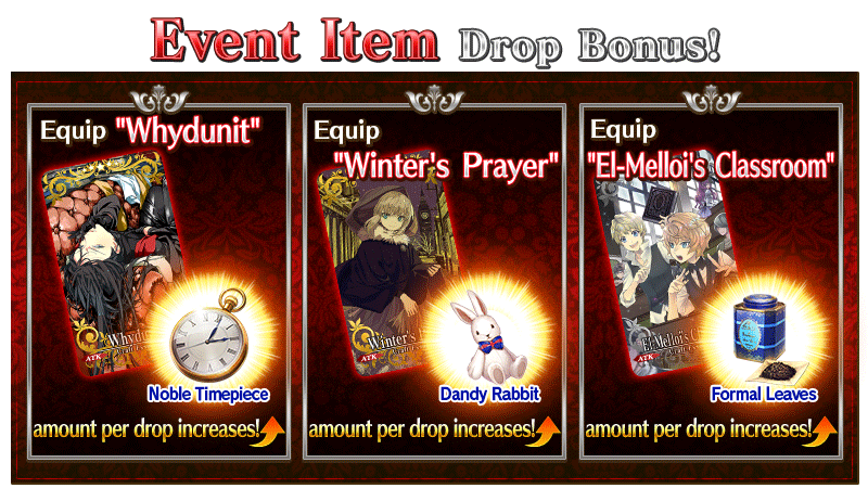 Limited Time Craft Essences "★5 (SSR) Whydunit," "★4 (SR) Winter's Prayer," and "★3 (R) El-Melloi's Classroom" will grant bonuses to the amount of event items "Noble Timepiece," "Dandy Rabbit," and "Formal Leaves" per drop.