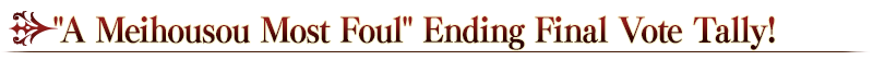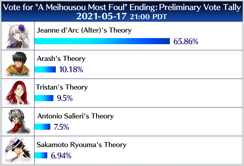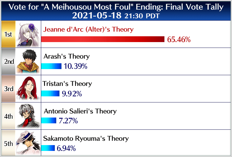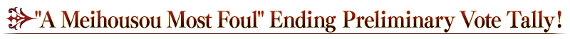 Voting for the ending of Limited Time Event "A Meihousou Most Foul" began at 2021-05-16 21:00 PDT, and the preliminary results are as follows.