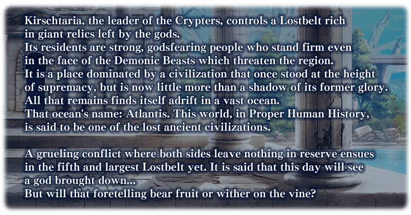 The fifth Lostbelt, "Ancient Ocean of the Dreadnought Gods, Atlantis - The Day to Bring Down Gods", takes you to Atlantis.