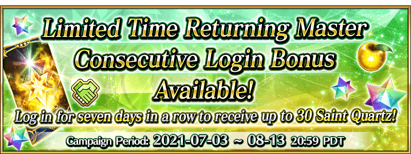 * The first Returning Master Login Bonus will be distributed on your first login after 2021-07-03 18:00 PDT.