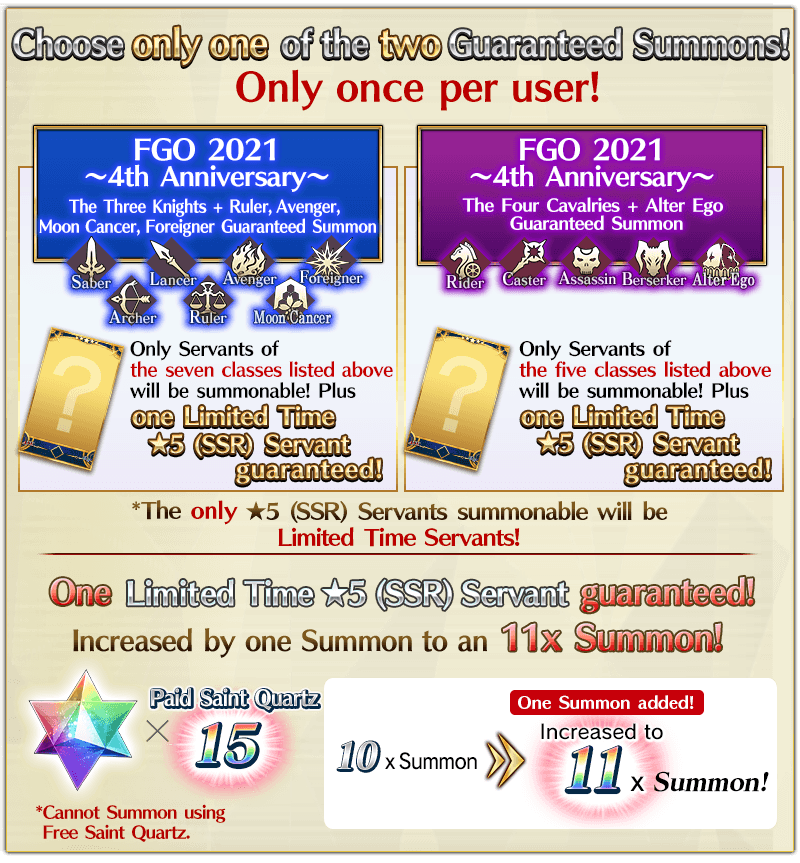 * Only Servants of the Saber, Archer, Lancer, Ruler, Avenger, Moon Cancer, and Foreigner classes will be summonable from the "FGO 2021 ~4th Anniversary~ The Three Knights + Ruler, Avenger, Moon Cancer, Foreigner Guaranteed Summon".