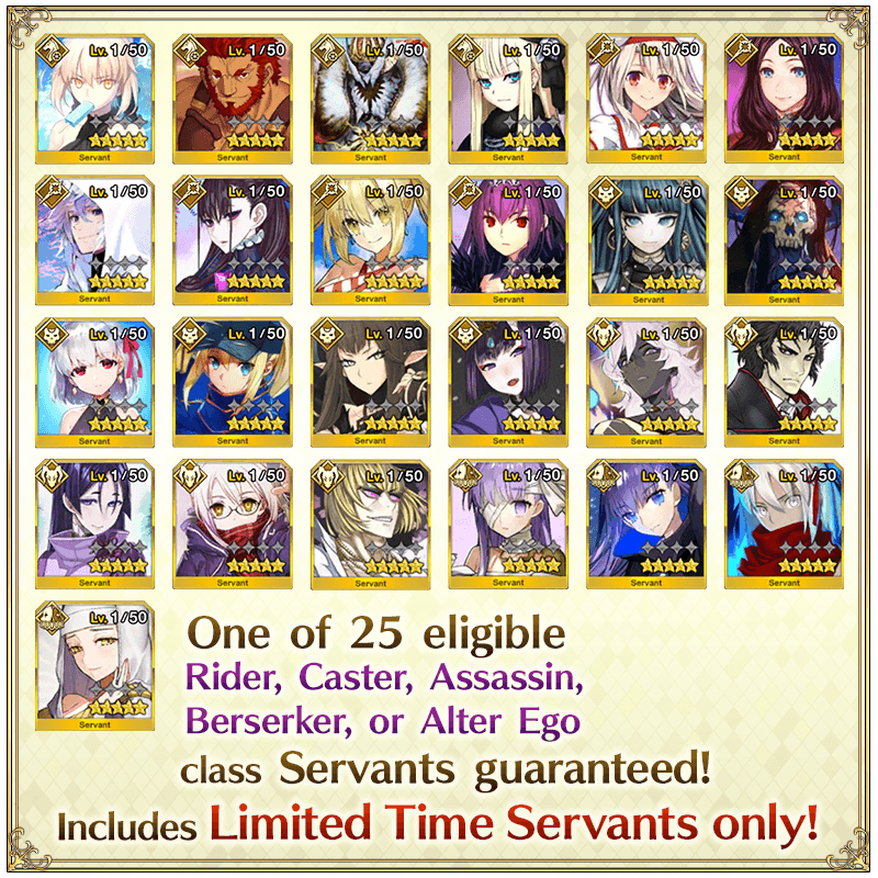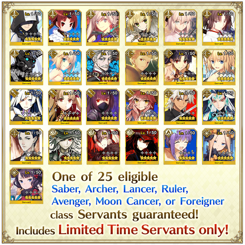 This Summon will have one guaranteed Limited Time ★5 (SSR) Servant, one guaranteed ★4 (SR) or above card, and one guaranteed ★3 (R) or above Servant!
