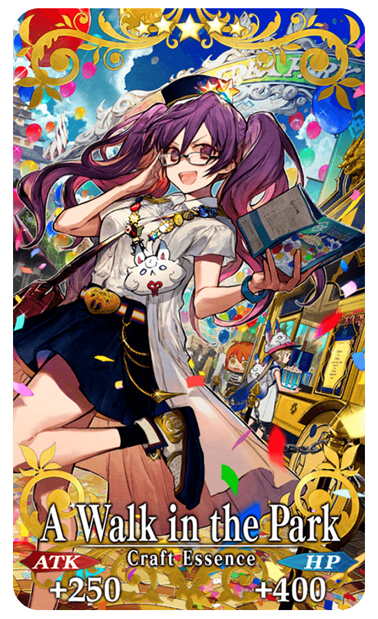 ★★★★★SSR A Walk in the Park ATK 250 (MAX: 1000) HP 400 (MAX: 1600) Skill Increase C. Star Gather Rate by 100% & NP Strength by 10% & begin battle with NP charged at 50% for yourself |
