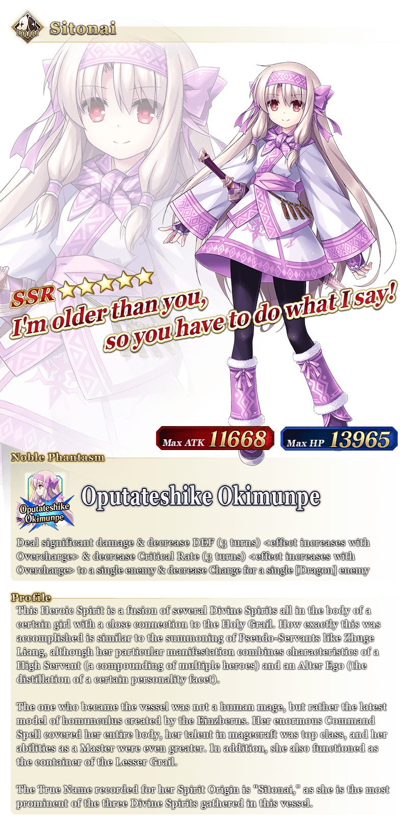 * All Masters will be able to participate in the Pickup Summon, regardless of story progression. * "★5 (SSR) Sitonai" will be summonable, even if she has not yet been added to Story Summon through story progression. * ★3 (R) Servants will also be summonable.