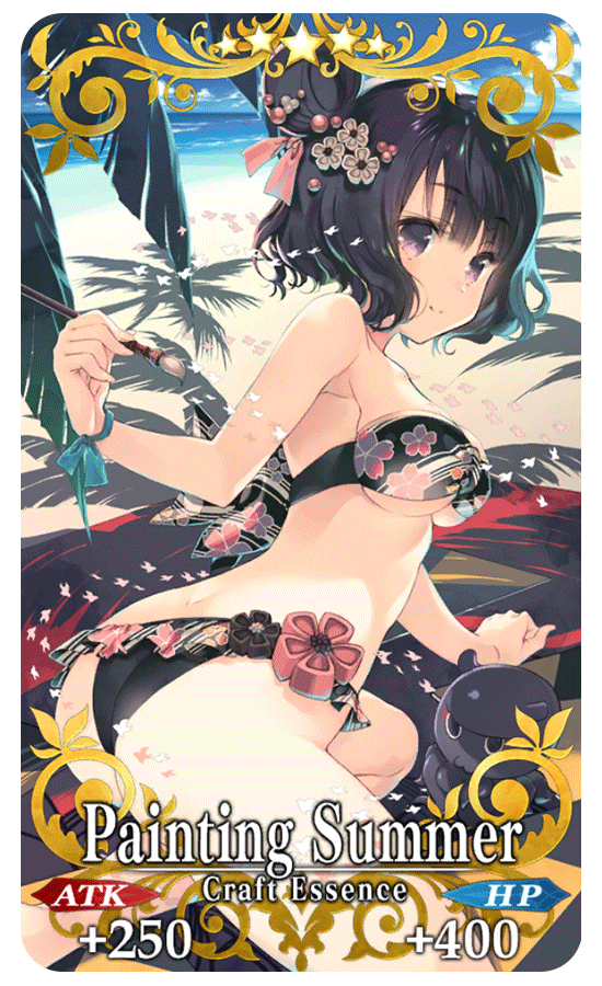 ★★★★★SSR Painting Summer ATK 250 (MAX: 1000) HP 400 (MAX: 1600) Skill Increase Arts Card effectiveness by 8% & NP Gain by 8% & begin battle with NP charged at 30% for yourself + Increase Doujin Technique amount per drop by 30% [Event Only]