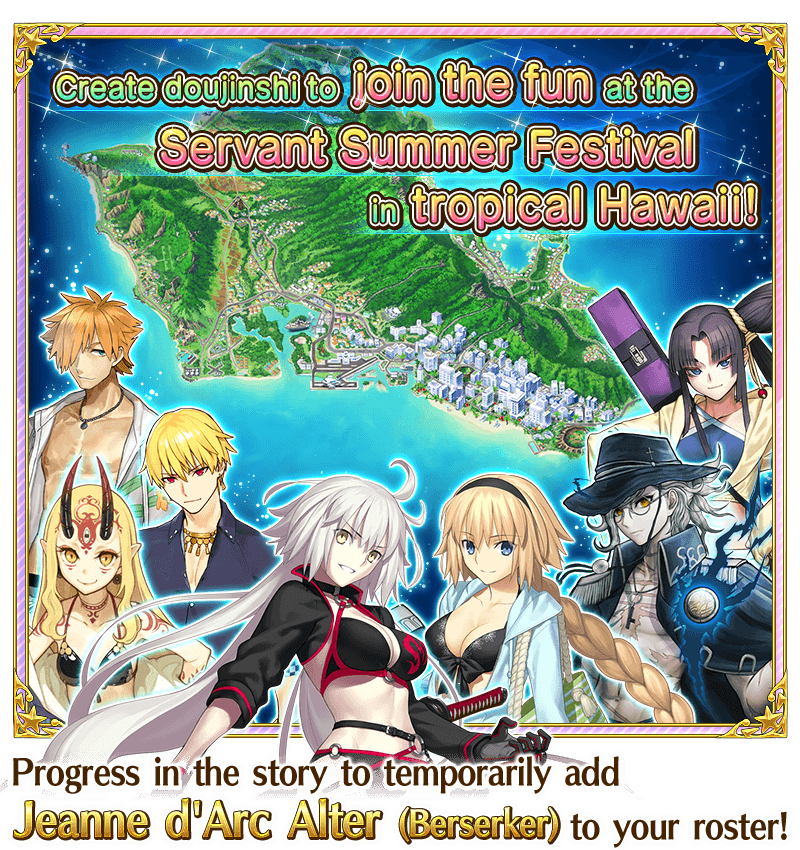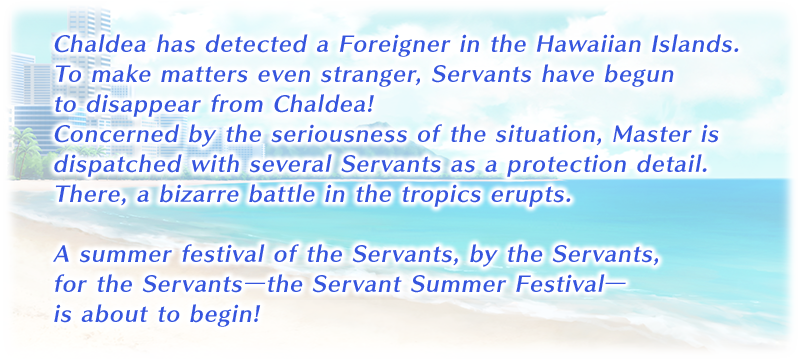 * This is a "Revival: Lite" version of the original 2020 Limited Time Event "Servant Summer Festival!". Certain elements have been adjusted for a more enjoyable experience. In addition, certain quests' requirements have been adjusted so that quests are unlocked in an order consistent with the story.