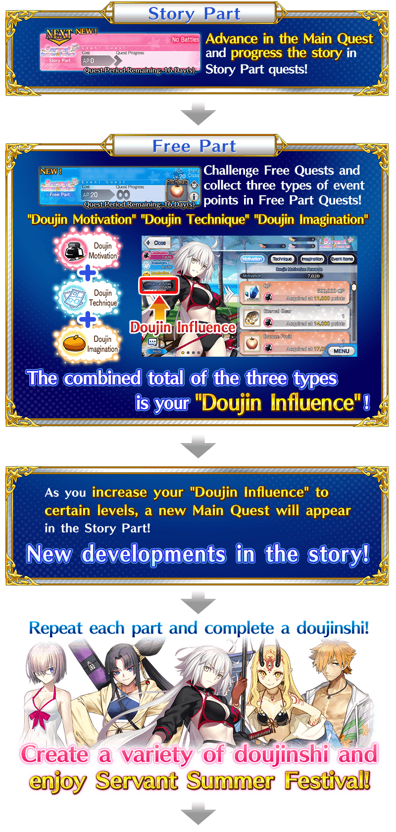 Equip the Event Limited Craft Essences "Water Shine", "Painting Summer", and "Foxy Lady", available through Event Item Exchange, to gain a bonus to the amount of "Doujin Motivation", "Doujin Technique", and "Doujin Imagination" per drop within Limited Time Event "Revival: Servant Summer Festival! Lite" quests.