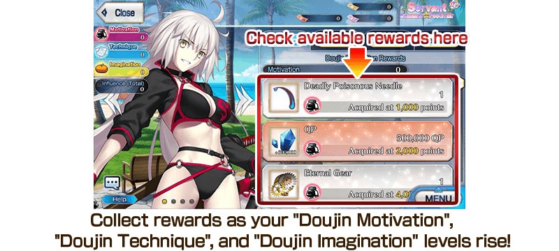 * "Doujin Motivation", "Doujin Technique", and "Doujin Imagination" totals will increase as you collect "Doujin Motivation", "Doujin Technique", and "Doujin Imagination" through event quest battle drops.