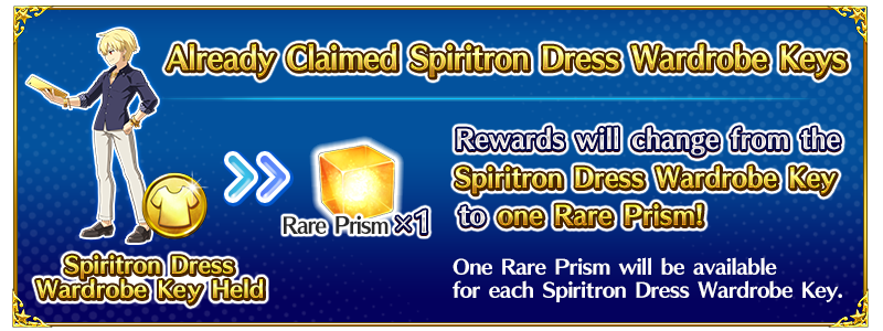 - If you acquired Spiritron Dress Wardrobe Keys in the original event, the equivalent rewards will be Rare Prisms.