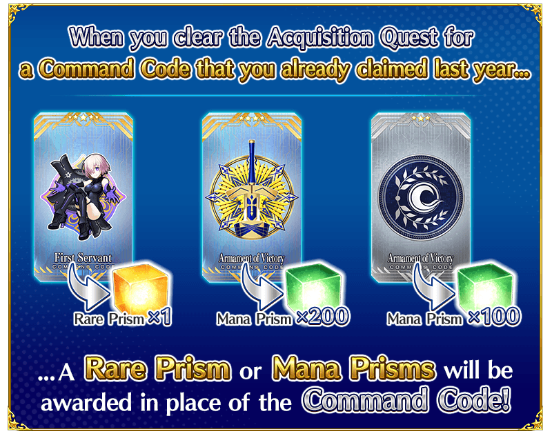 - If you acquired Command Codes in the original event, the equivalent rewards will be a Rare Prism or Mana Prisms.
