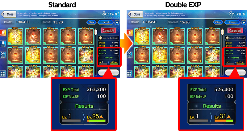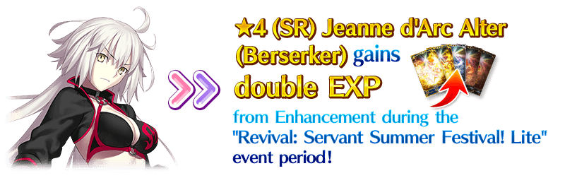 For the duration of the event period, "★4 (SR) Jeanne d'Arc Alter (Berserker)" will receive double EXP when performing Enhancement.