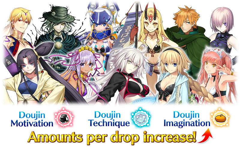 Certain Servants will receive a bonus to "Doujin Motivation", "Doujin Technique", and "Doujin Imagination" acquisition, as well as a bonus to Bond Points gained, within event quests during the event period.