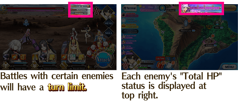 Each battle will end when the enemy's normal HP gauge is reduced to 0, a set number of turns has passed, or your party is defeated. When the "Total HP" is reduced to 0, that enemy will be defeated for good.