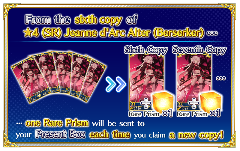 Once you have acquired a total of six copies of "★4 (SR) Jeanne d'Arc Alter (Berserker)", one Rare Prism will be awarded for each new copy of the same Servant, beginning with the sixth.