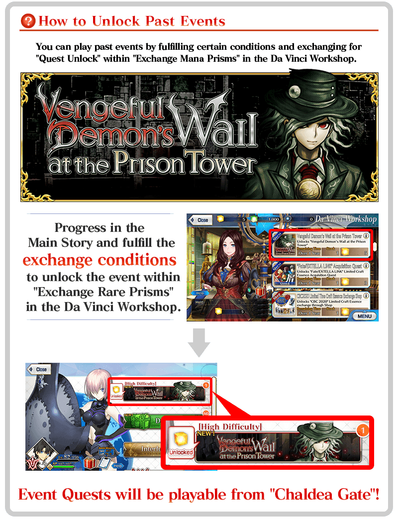The event quests of "Vengeful Demon's Wail at the Prison Tower", a past Limited Time Event meant to challenge high level players, will be unlockable from "Exchange Rare Prisms" in the Da Vinci Workshop.