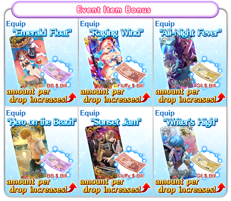 Equip the Limited Time Craft Essences "Emerald Float", "Raging Wind", "All-Night Fever", "Hero on the Beach", "Sunset Jam", and "Writer's High", available through the ongoing Pickup Summons, to gain a drop bonus for each of the event items "BB $ Bill", "Fluffy $ Bill", and "Gil $ Bill".