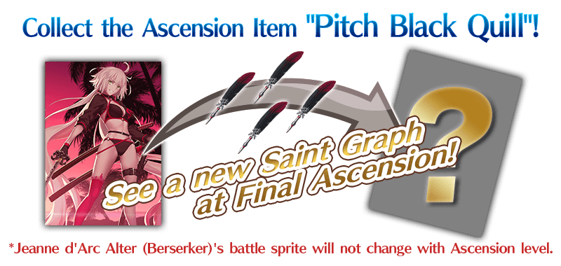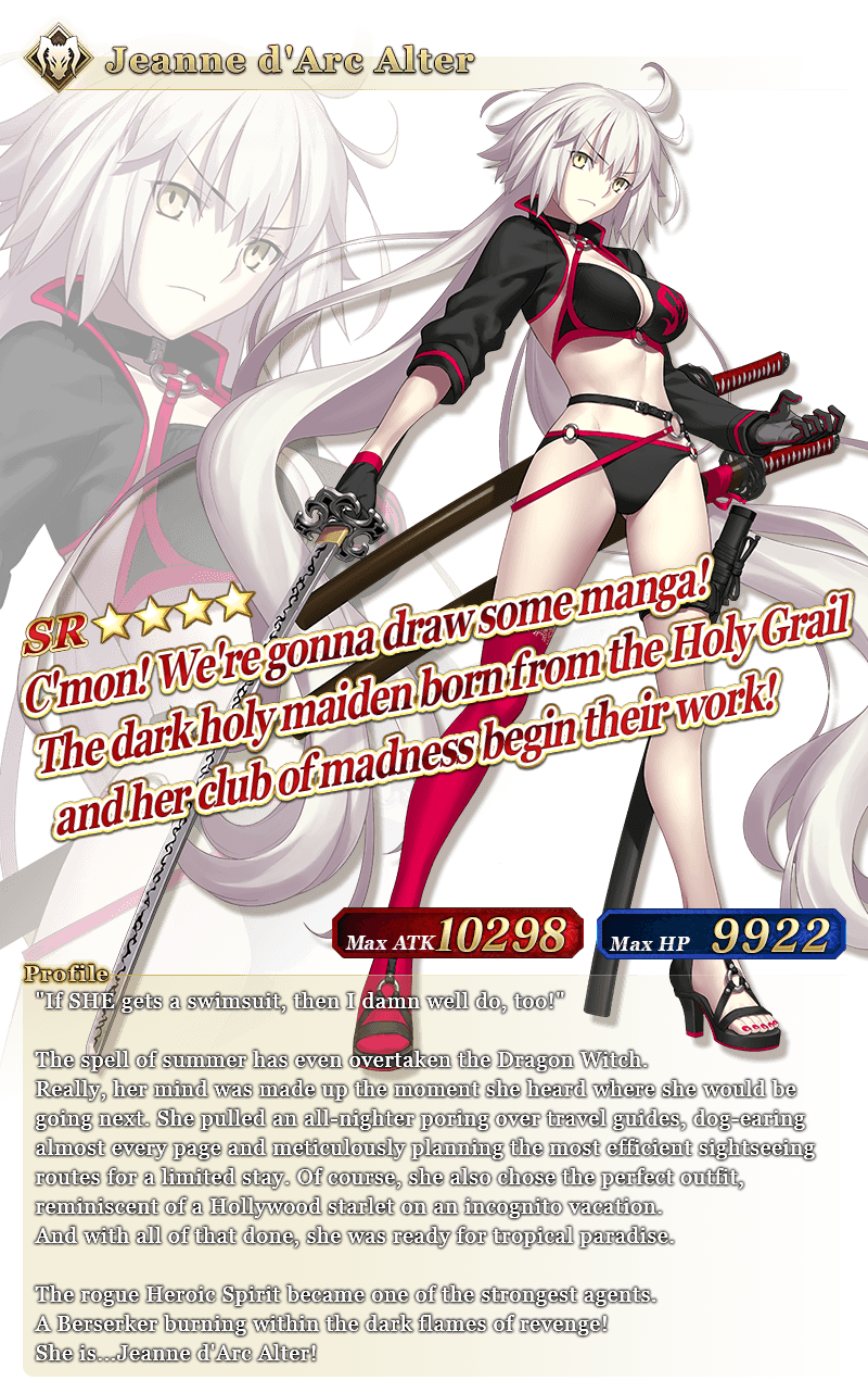 * Noble Phantasm Enhancement for Event Limited Servant "★4 (SR) Jeanne d'Arc Alter (Berserker)" will be possible by clearing certain quests scheduled to be unlocked at a later date within the Limited Time Event "Servant Summer Festival!". It will not be possible to raise her Noble Phantasm level at the beginning of the event period.