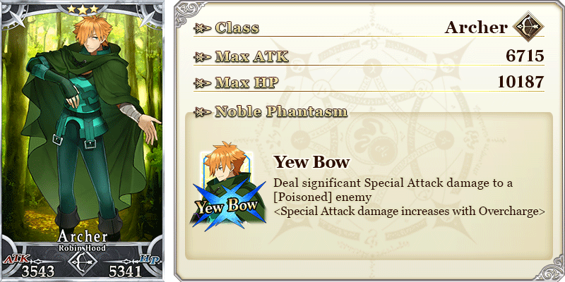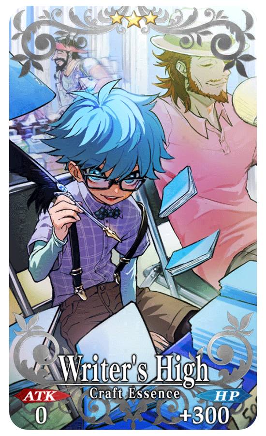 ★★★R Writer's High ATK 0 HP 300 (MAX: 1500) Skill Increase NP Gain by 5% & NP Strength by 5% for yourself + Increase Gil $ Bill amount per drop by 1 [Event Only] ![]() |